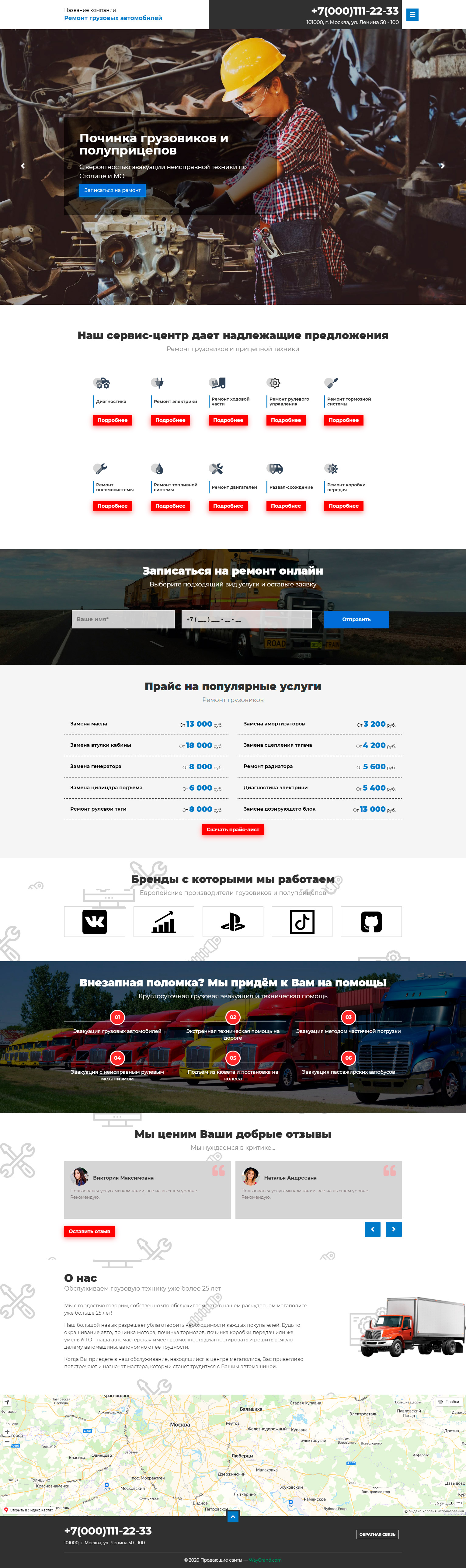 - Промогалерея "Починка грузовиков и полуприцепов" с кнопкой призыва к действию "Записаться на ремонт"